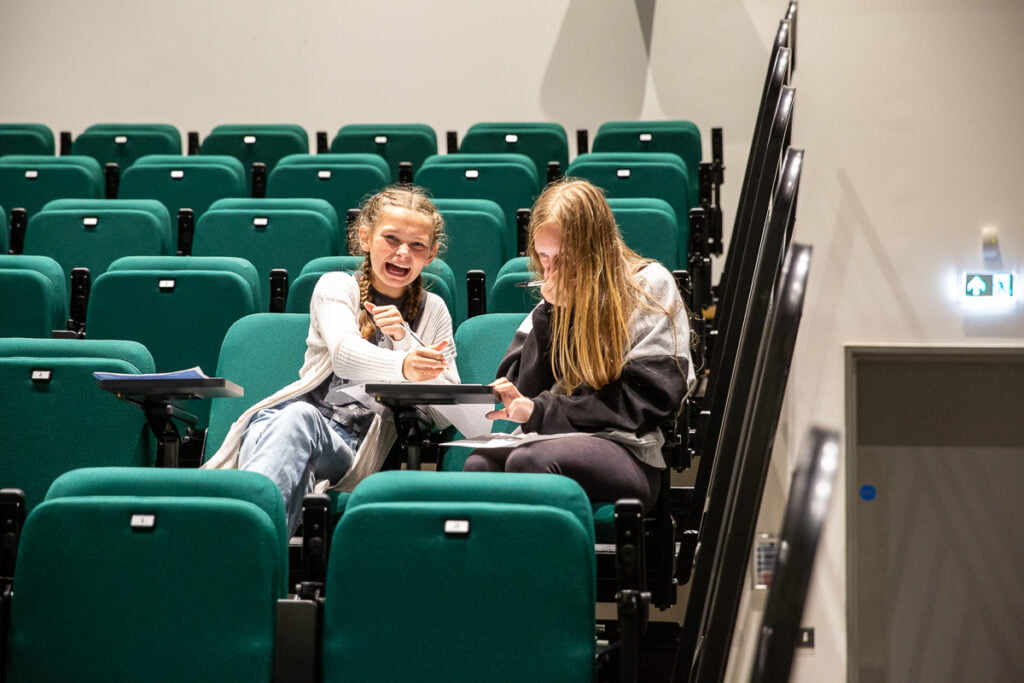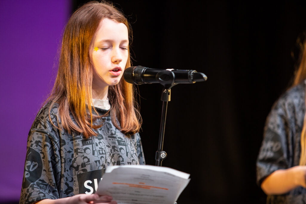 Showcase Day felt tense. There were a lot of last-minute notes, wobbles, and tears. Each time, young poets were crowded around and showered with encouragement and joy. When the groups had finished rehearsals, for the first time that weekend, the building fell quiet. The nerves were taking hold and the sound of excitable teenagers was replaced with catering trolleys wheeling across the space and the DJ setting up in preparation for the afterparty.